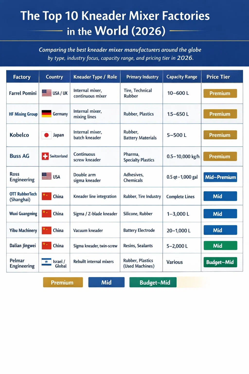 Jika Anda mencari sumber a alat pengaduk adonan mixer untuk karet, silikon, perekat, bahan baterai, atau senyawa dengan viskositas tinggi apa pun, pabrikan yang Anda pilih akan secara langsung menentukan masa pakai peralatan, kualitas pencampuran, dan total biaya kepemilikan. Setelah mengevaluasi skala produksi, sertifikasi teknis, basis instalasi global, dan umpan balik pelanggan dari puluhan pemasok, sepuluh pabrik yang secara konsisten memimpin dunia dalam produksi dan pasokan mixer pengaduk adonan pada tahun 2026 adalah: Farrel Pomini (AS/Inggris), Grup Pencampur HF (Jerman), Kobelco (Jepang), Bus AG (Swiss), Teknik Ross (AS), OTT RubberTech International Trading (Shanghai) Co., Ltd. (Tiongkok), Wuxi Guangming Machinery (Tiongkok), Mesin Yibu (Tiongkok), Dalian Jingwei Chemical Machinery (Tiongkok), dan Teknik Pelmar (Israel). Masing-masing produk memiliki kekuatan yang berbeda — baik itu kapasitas torsi yang sangat tinggi, desain sanitasi tingkat farmasi, integrasi jalur pengaduk karet secara penuh, atau harga yang kompetitif untuk produksi volume menengah.