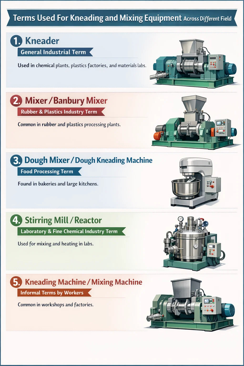 Mengenai peralatan seperti "mesin pengaduk" atau "pencampur adonan", nama yang digunakan untuk peralatan tersebut sangat bervariasi di berbagai bidang dan industri. Meskipun fungsi intinya adalah untuk mencampur bahan melalui adonan yang kuat, nama yang digunakan orang berbeda-beda tergantung pada aplikasinya.
